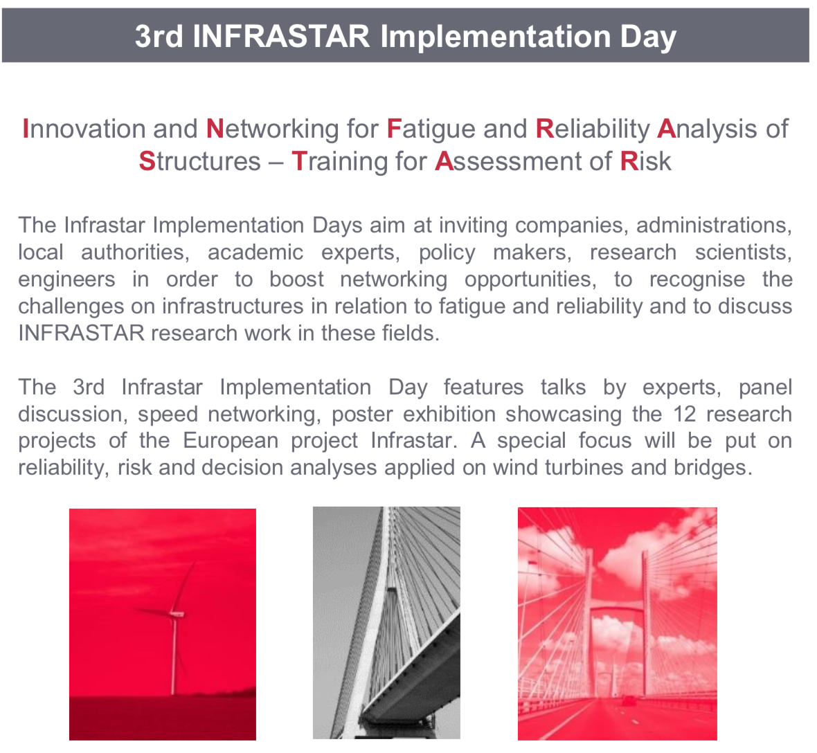 The Infrastar Implementation Days aim at inviting small and large companies, administrations, local authorities, academic experts, policy makers, research scientists, engineers in order to boost networking opportunities, to recognise the challenges on infrastructures in relation to fatigue and reliability and to discuss Infrastar research work in these fields.