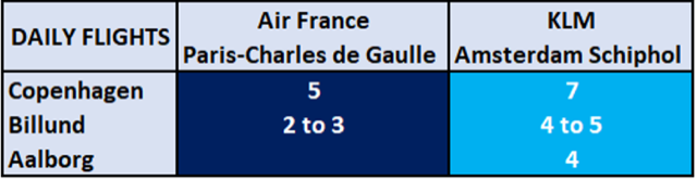 Air France and KLM offer up to 24 daily flights from Denmark to Paris and Amsterdam with further connection throughout the world. Get latest information here airfrance.dk
