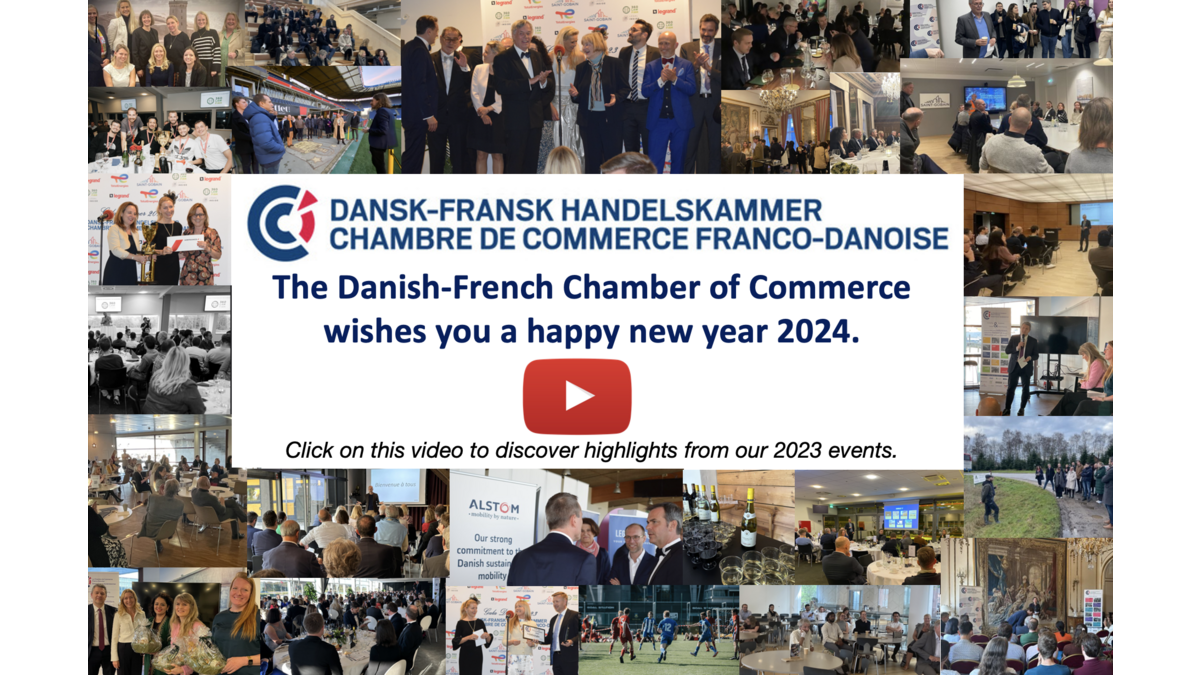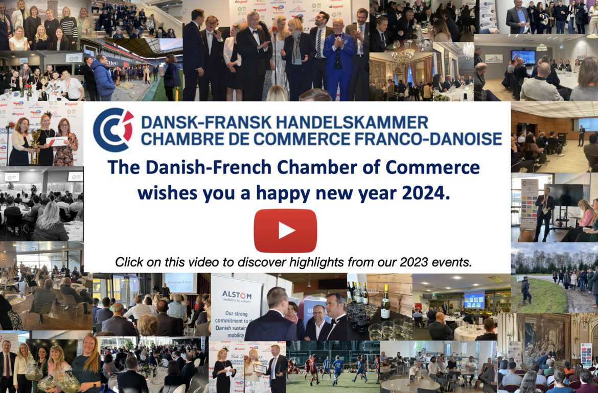 The Danish-French Chamber of Commerce wishes a happy New Year to you, your friends, your colleagues and your family. Discover some highlights of our 2023 events by clicking on the video below. If you have participated in one of our events last year, you might find your smile on one of the pictures.