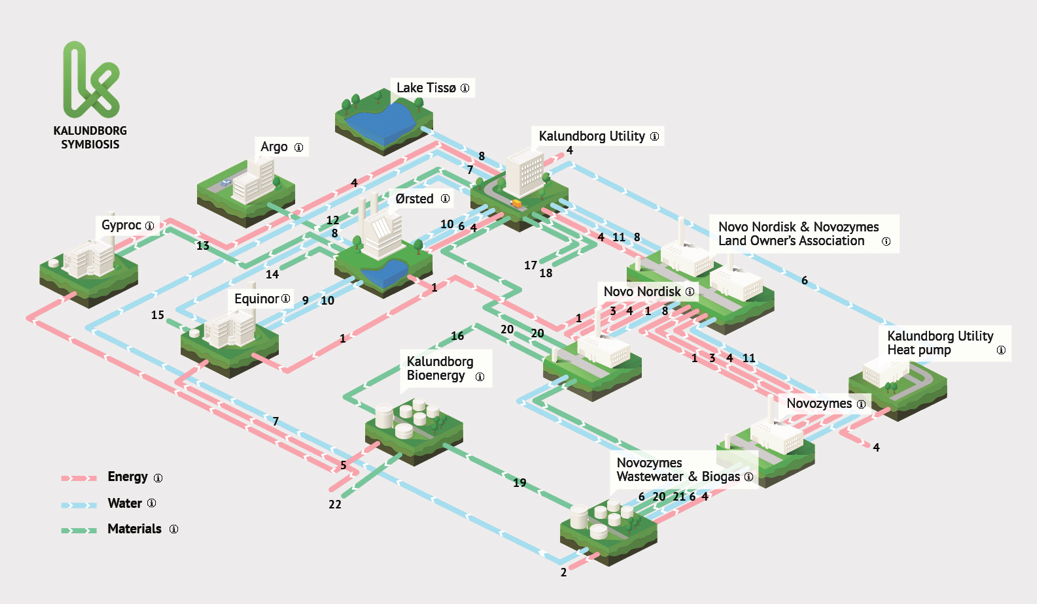An industrial symbiosis is a collaboration on resources between different companies for mutual economic and environmental benefit. One company’s residual becomes another company’s resource. The Kalundborg Symbiosis exists since the 1970s and reports every year a net economy of 24 million €, and 14 million € in socio-economic impact, according to the Ellen MacArthur Foundation. The companies save together every year 635 000t of CO2, 3,6 million square meters of water and 87 000t of raw material. It is the first industrial symbiosis in the world. It provides its members with both environmental and ecological benefits.